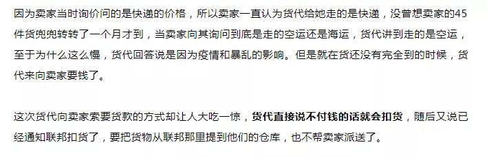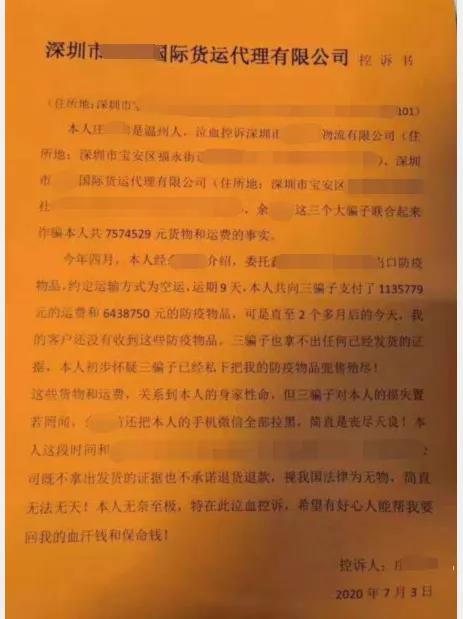 案例3:賣家泣血控訴深圳某某貨代和某某貨代聯合欺詐,涉及一(yī)百多萬的運費(fèi)和六十多萬的防疫物資貨款,直到今天兩個多月過去(qù)了其國外(wài)客戶都未收到貨,損失慘重。