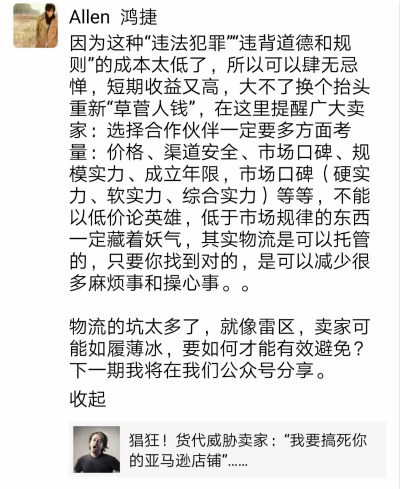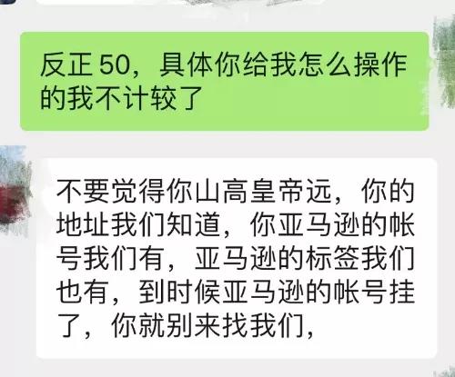 你的地址我們知(zhī)道,你亞馬遜的帳号我們有,亞馬遜的标簽我們也有,到時候亞馬遜的帳号挂了,你就别來找我們。