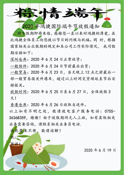 2020年鴻捷國際端午節放(fàng)假通知(zhī)