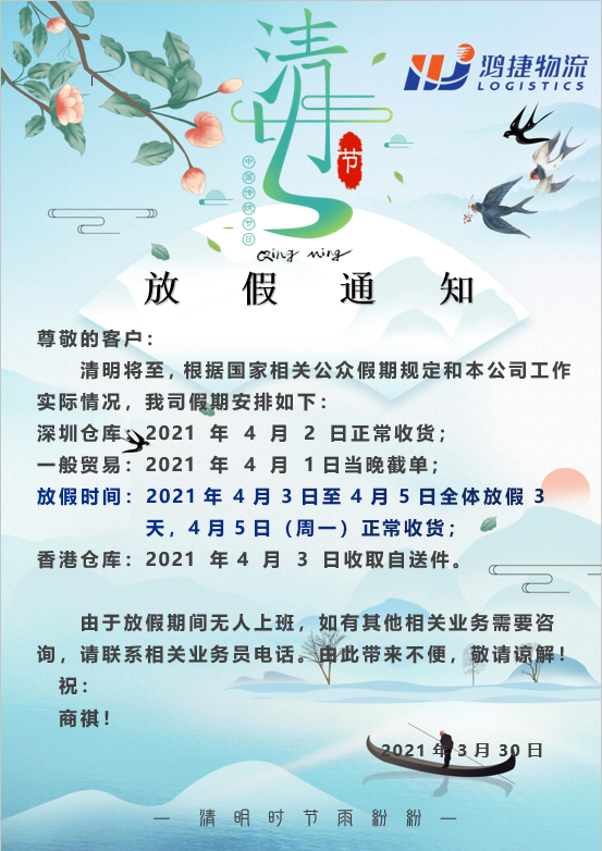 鴻捷物流2021年清明節放(fàng)假通知(zhī)